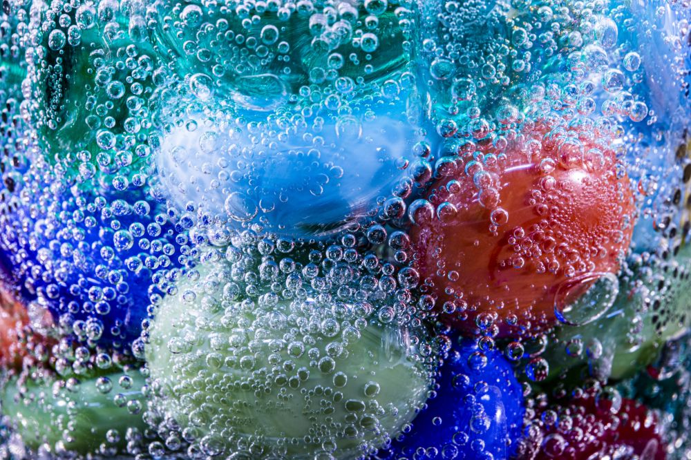 Marbles in a glass of fizzy water