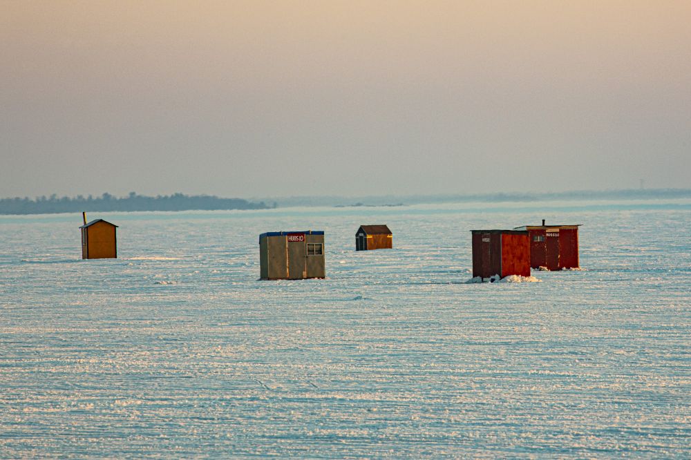 Some ice fishing huts on frozen Lake Couchiching near Orillia, Ontario, Canada