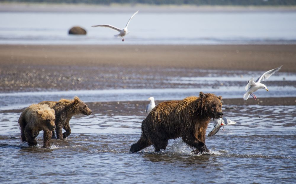 A mother bear fending off gulls from her salmon catch while kids follow.