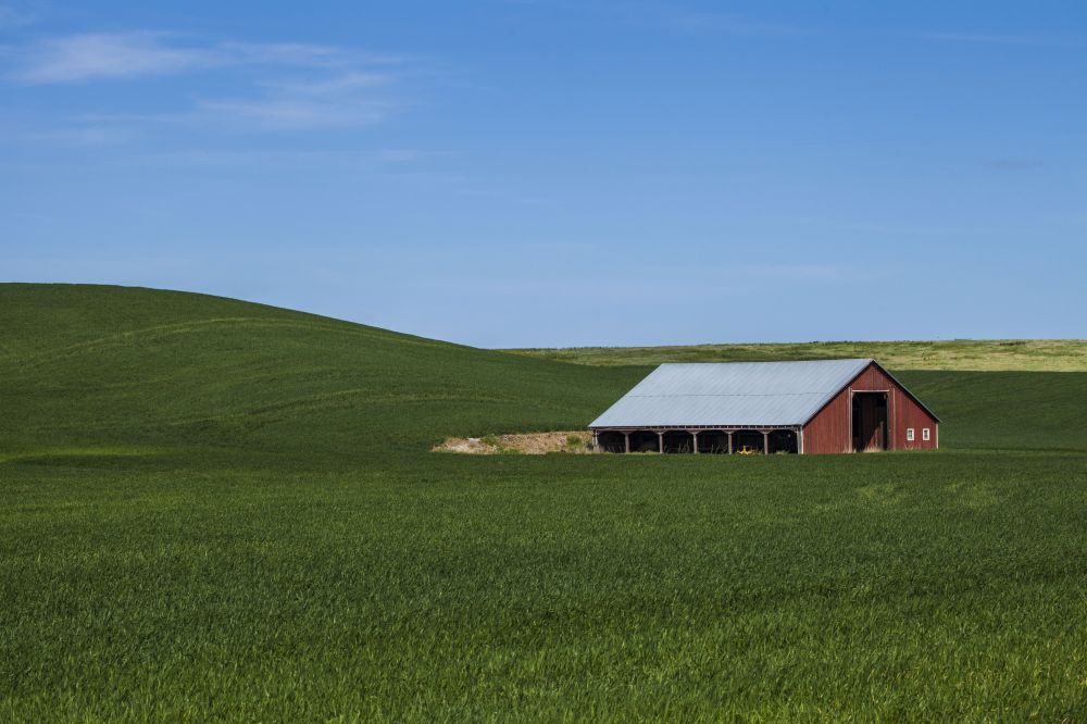 Red barn in a wheat field in the Palouse region of Washington